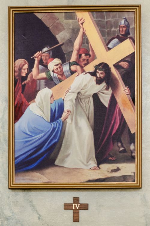 On The Way, Jesus falls three times under the weight of his cross, yet he encounters instruments of mercy FOUR times: His Mother, Simon, Veronica, the Women of Jerusalem. Further, there to receive him at the end of his pilgrimage is the Beloved Disciple, Nicodemus, and Joseph of Arimathea. Amidst the heavy darkness, there is always a ray of light.