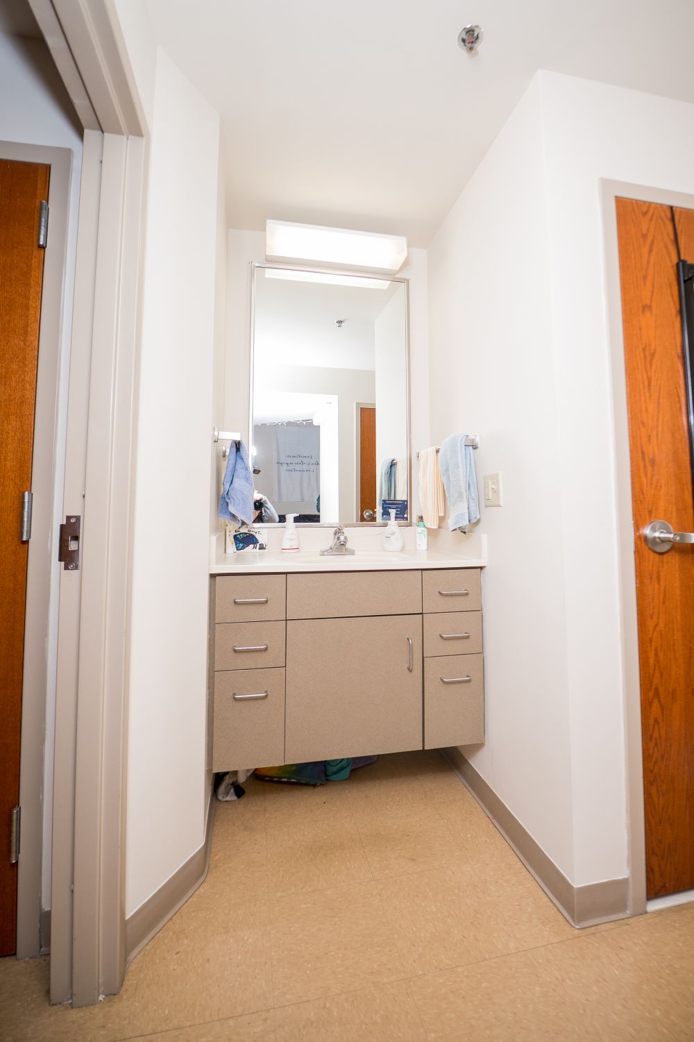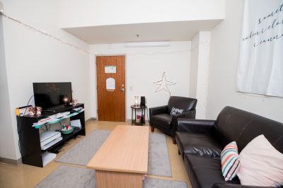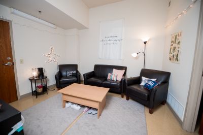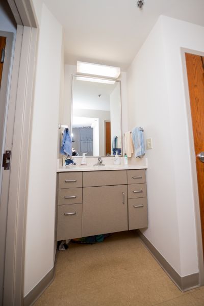 Newman North Single Suites house 4 residents in 4 individual bedrooms with a shared living room and bathroom. Single suite bedrooms are large and fully furnished, with plenty of room and large closets. Each spacious suite comes furnished with comfortable couches and chairs for the living room, and fully loftable and bunkable beds, lockable dressers, and large desks with a hutch and comfortable work chair. Shared suite bathrooms include a separate vanity and sink area, shower area, and toilet area for maximum convenience in a shared living environment.