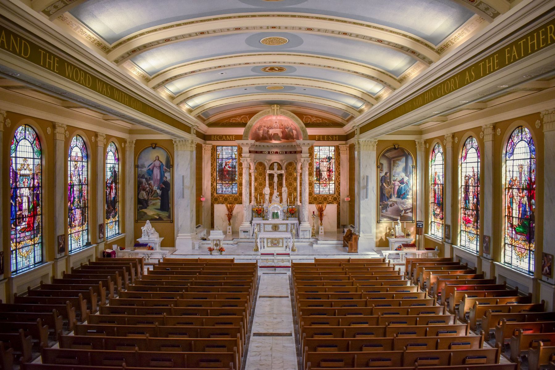 Encircling the nave is the beginning of John's Gospel, “In the beginning... the Word became flesh.”